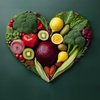 Colorful assortment of fresh vegetables and fruits arranged in a circular pattern on a black surface, including tomatoes, bell peppers, grapes, pumpkin, avocado, radicchio, beets, strawberries, blood orange, and leafy greens.